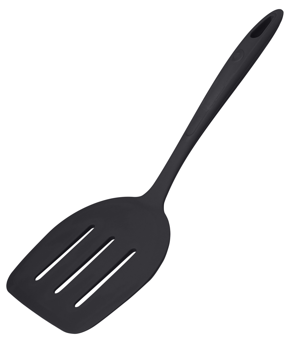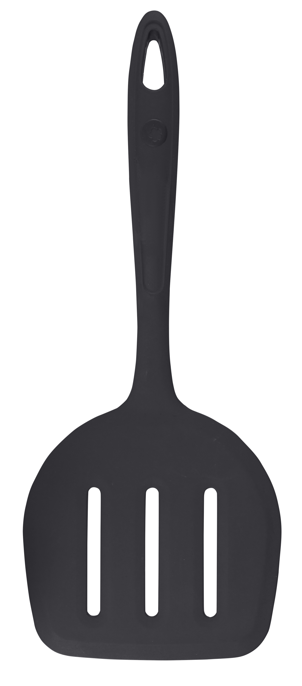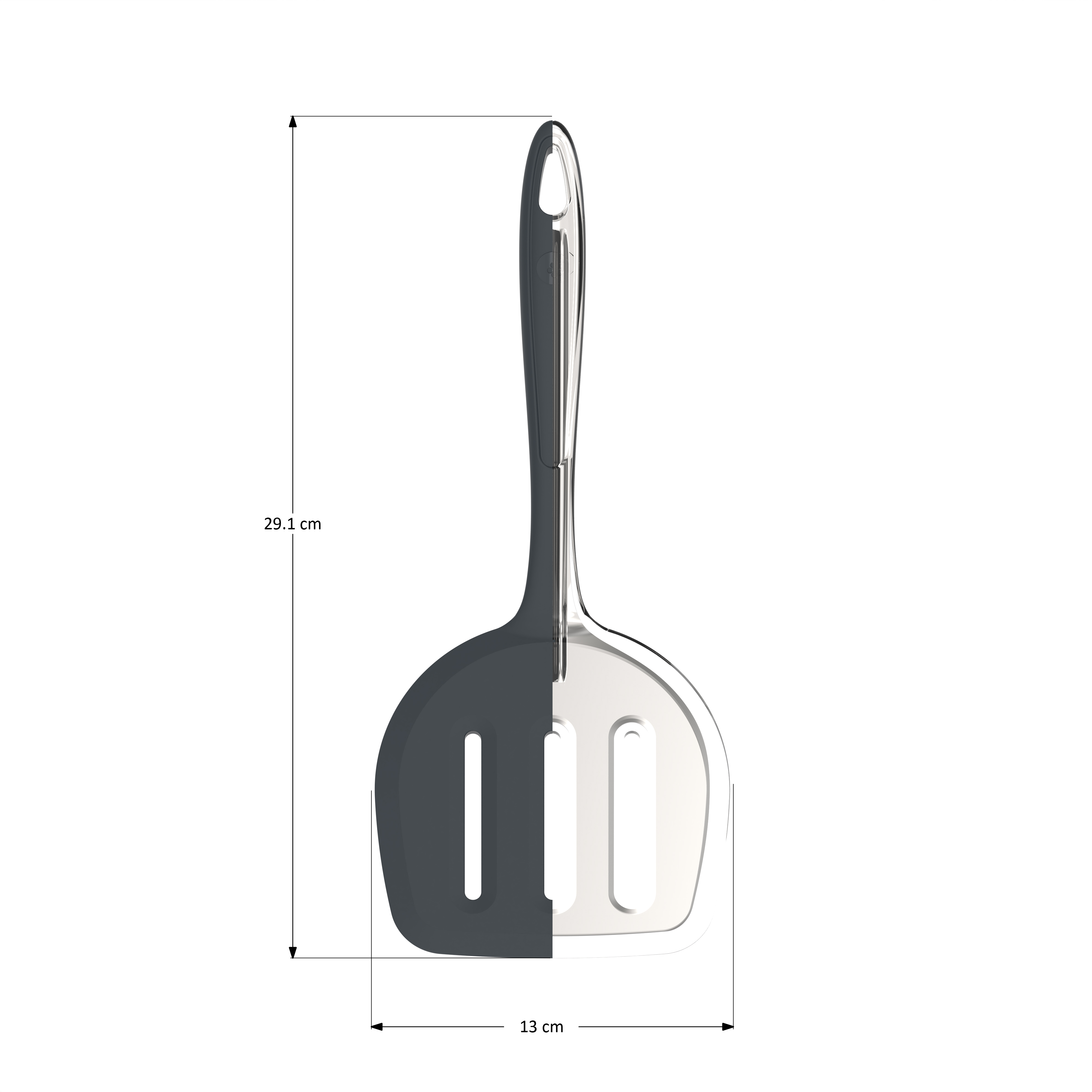 Enyhén ferde, lapos formája segít, hogy könnyedén a sütés alatt lévő étel alá csússzon, míg a három nyílásos kialakítás segít abban, hogy a zsiradék vagy alaplé az edényben maradjon.
