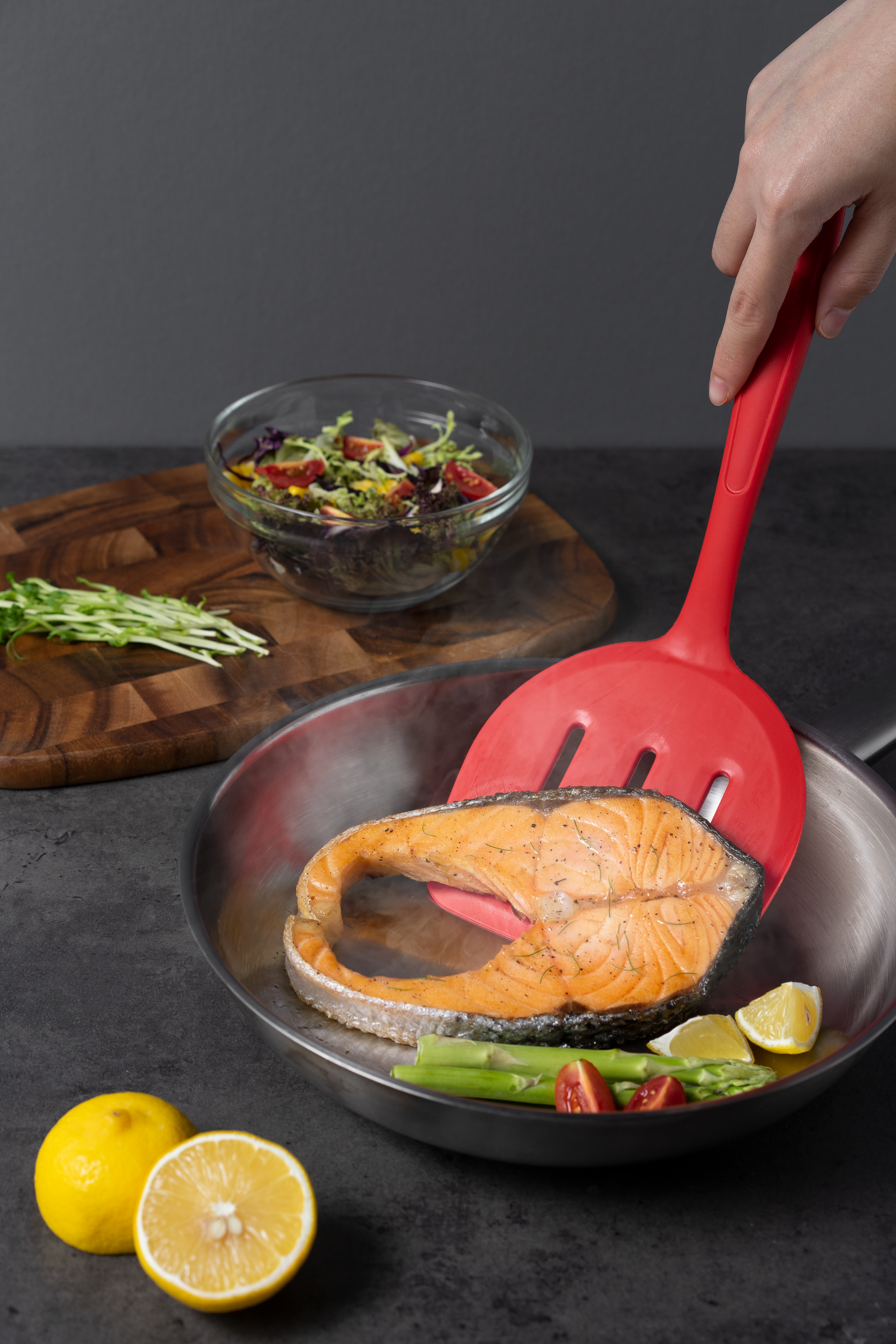 Különösen alkalmas nagyobb méretű ételek, például palacsinta, tócsni, omlett, tükörtojás, hal vagy hús forgatására, főleg ha serpenyőben vagy sütőedényben készíted őket.
