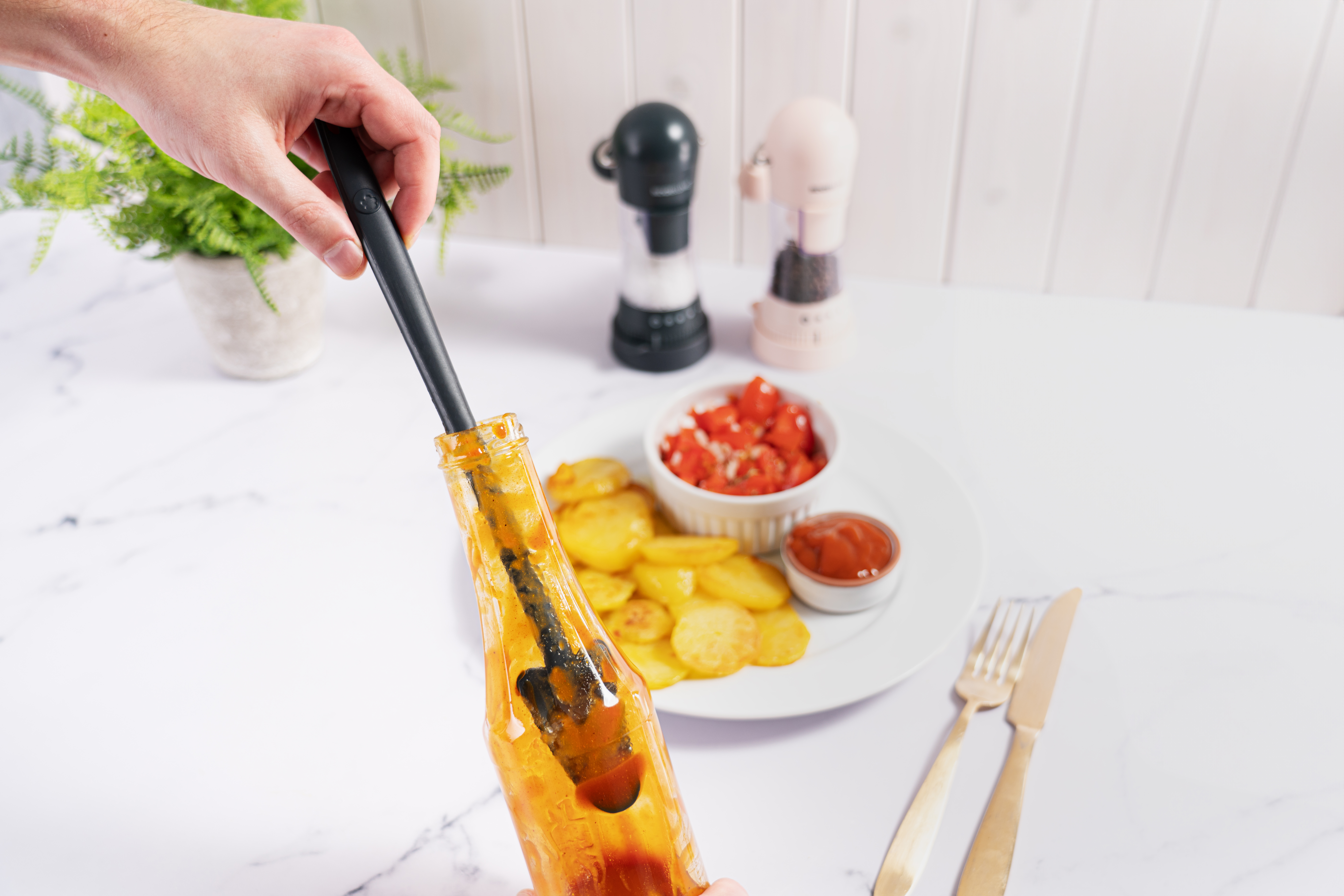Rugalmas szilikon fejének köszönhetően könnyedén eléri az üvegek, poharak és palackok legmélyebb sarkait is. Ideális Nutella, joghurt, méz, szószok vagy turmixmaradékok kiürítéséhez, de étkezéshez is használható.