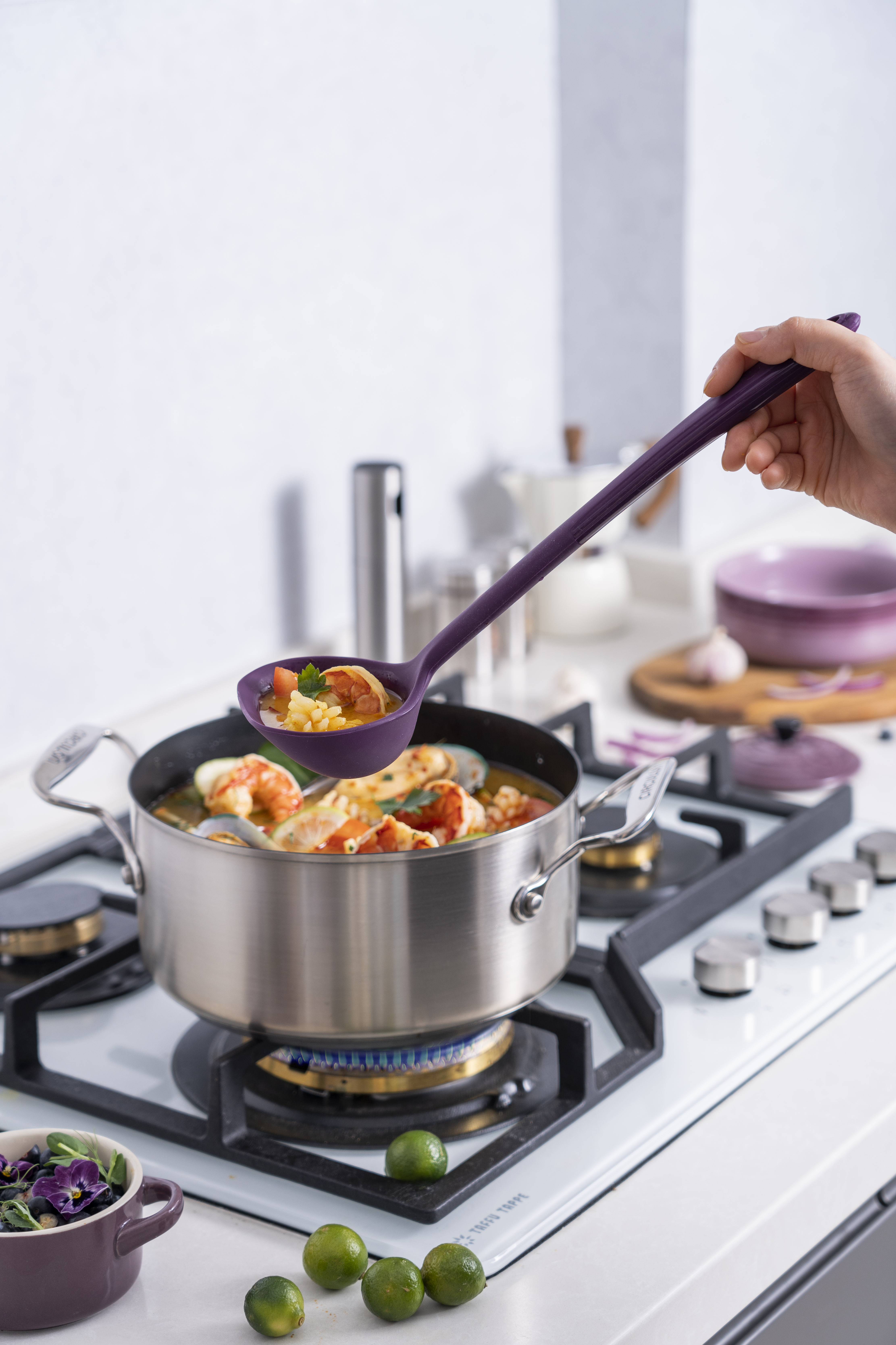BPA-mentes, hőálló szilikon, rozsdamentes acél maggal a stabilitásért. 100 ml-es űrtartalommal levesek, szószok, pörköltek, palacsinta- vagy gofritészta adagolásához ideális. Kíméli az edények felületét, mosogatógépben tisztítható.
