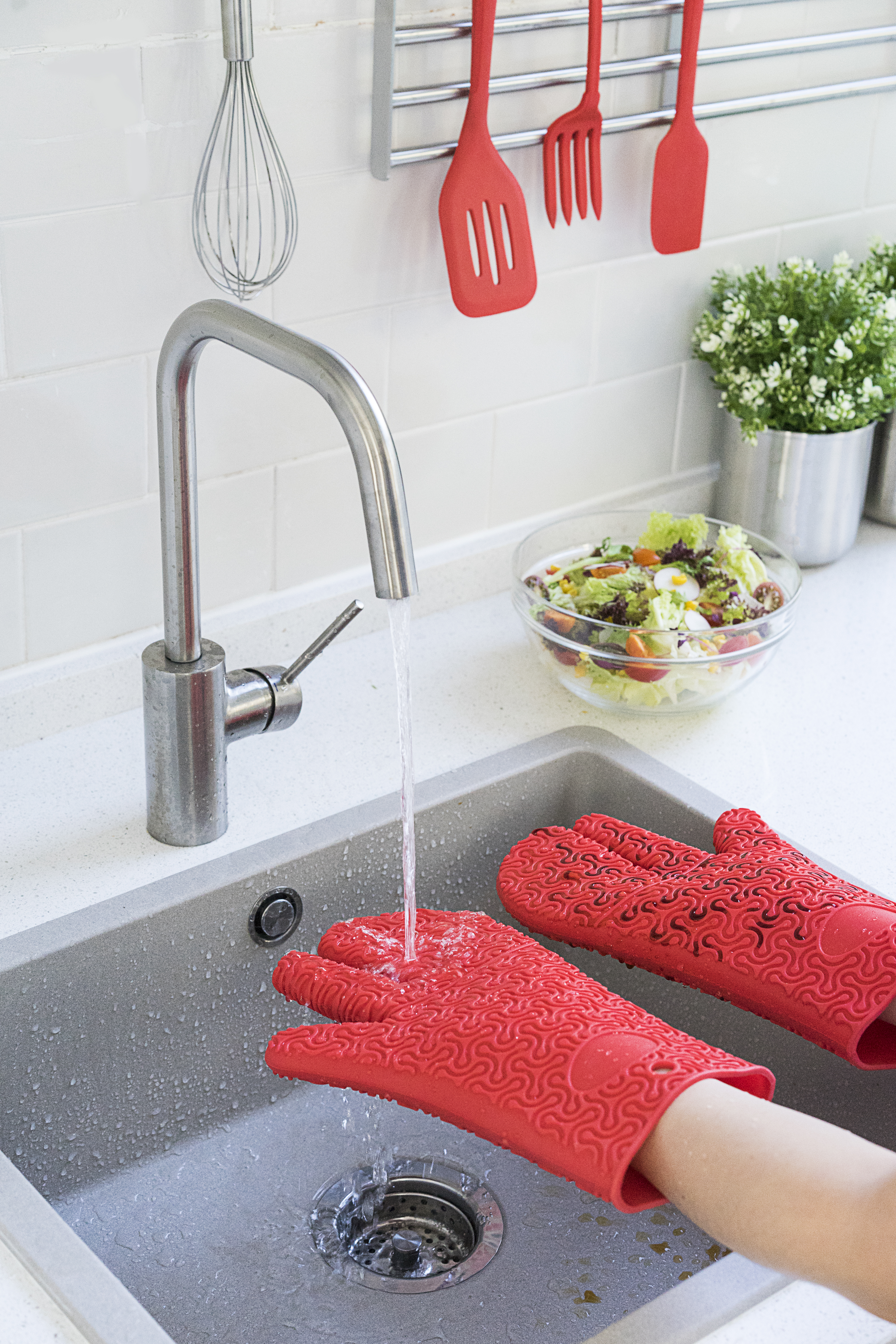 A szuper 260°C-ig hőálló szilikon ellenáll a legforróbb kihívásoknak is.  A rugalmas anyag tökéletesen illeszkedik a kezedhez, így stabil fogást biztosít – többé nem csúszik ki semmi a kezedből!