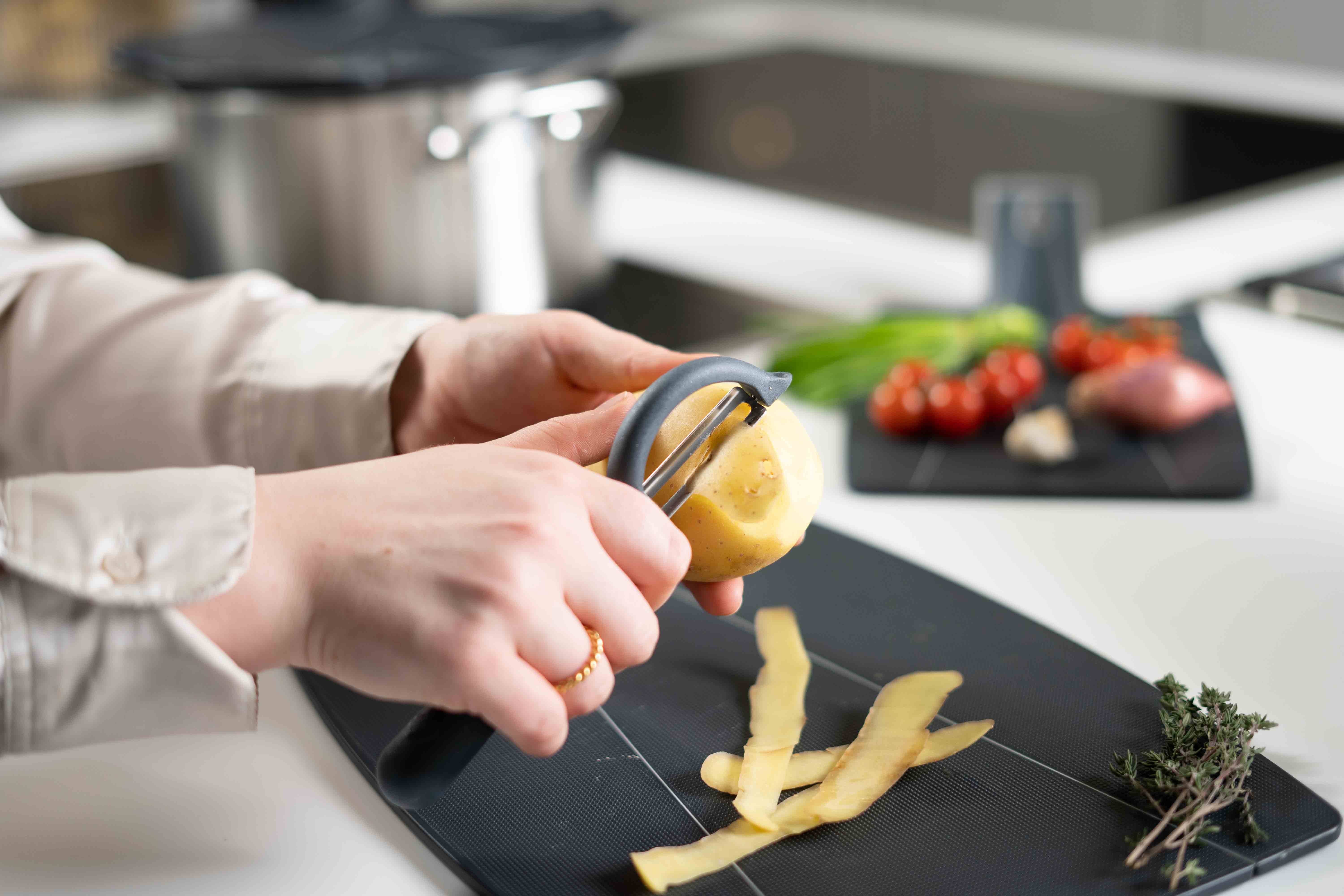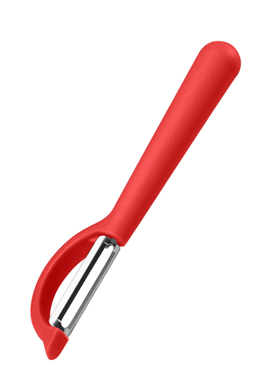 Az érdesített nyélnek köszönhetően a hámozó szilárdan és biztonságosan ül a kézben, még nedves ujjakkal is.