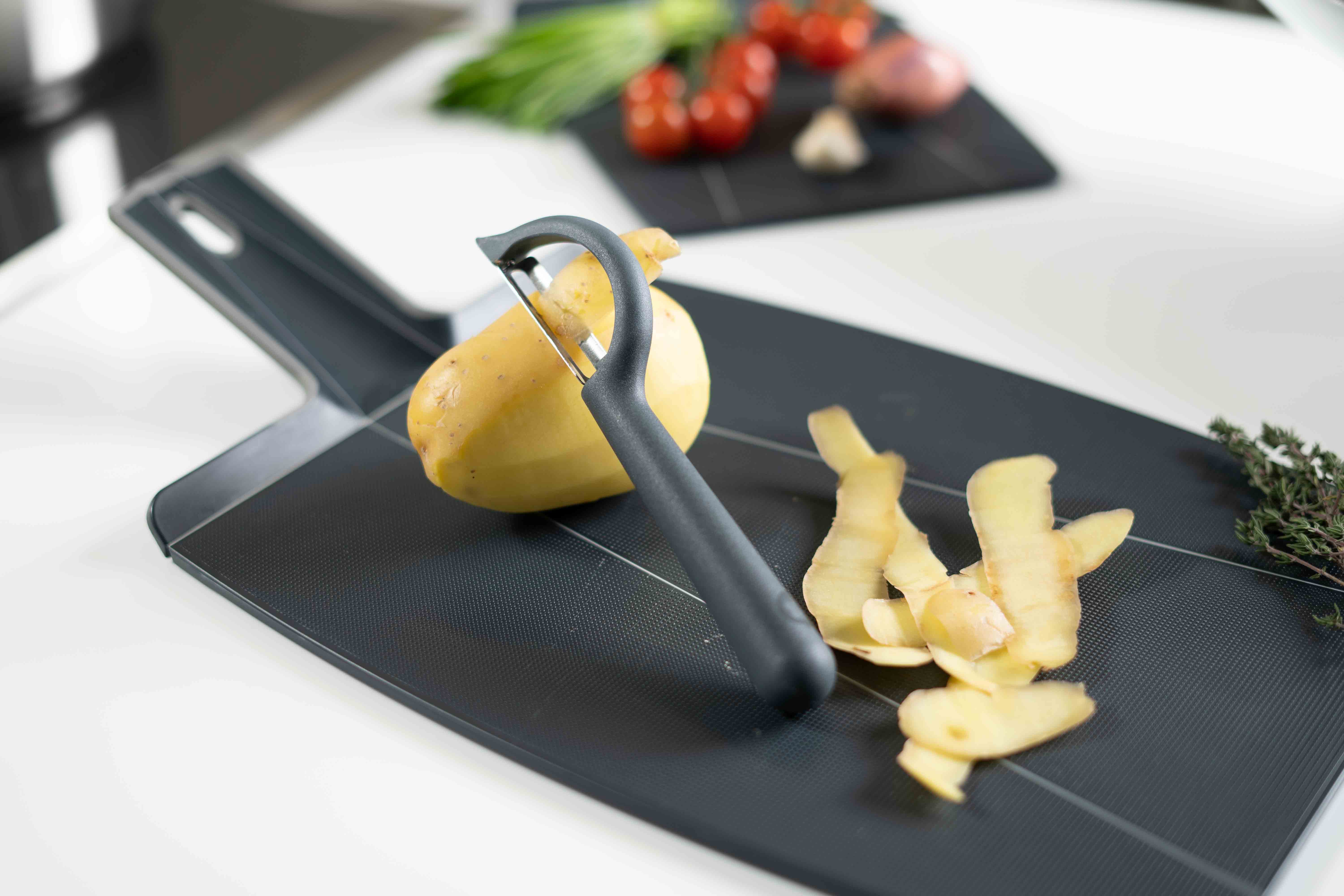 A nagyon éles rozsdamentes acél pengék gyerekjátékká teszik a gyümölcsök és zöldségek héjának eltávolítását