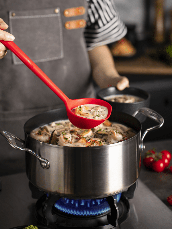 A merőkanál rugalmas kialakításának köszönhetően az edények minden sarkát elérheted. Legyen szó szószokról, levesekről, pörköltekről, puncsokról vagy forralt borról – még a legkisebb borsószem sincs biztonságban ettől a merőkanáltól. Akár 100 ml- t is befogad , és tökéletes palacsinta- vagy gofritészta adagolásához. Masszív rozsdamentes acél magjának köszönhetően a merőkanál méretstabil, tartós és robusztus, míg a szilikon bevonat védi a felületeket. Ez azt jelenti, hogy a fazékban vagy serpenyőben hagyhatod anélkül, hogy aggódnod kellene, hogy megégeted magad a nyéllel.
