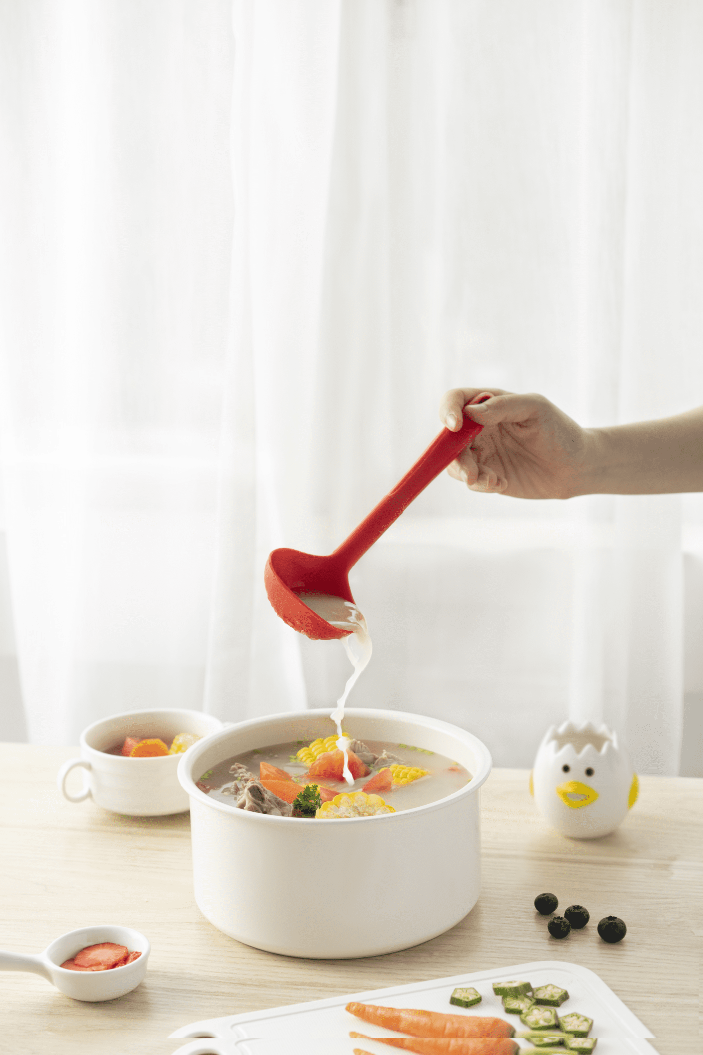 BPA-mentes, hőálló szilikon, rozsdamentes acél maggal a stabilitásért. 100 ml-es űrtartalommal levesek, szószok, pörköltek, palacsinta- vagy gofritészta adagolásához ideális. Kíméli az edények felületét, mosogatógépben tisztítható.